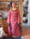 Die Körpernähe wird erreicht durch Schnürungen im Taillenbereich; hier ist das Kleid so geschnitten, dass das Unterkleid (oder – ganz gewagt – nackte Haut) sichtbar werden soll, die Schnürung zieht es dicht an den Körper und erreicht die der frühgotischen Mode entsprechenden Querfältchen über dem Bauch.