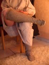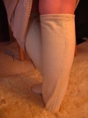 Kniestrümpfe aus Stoff (schräg zur Webrichtung), mit Tunnelzug und fingerschlaufengewebten Bändchen am oberen Ende